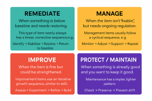 Life throws up different kinds of challenges — some need fixing, some need managing, some need building, and some just need preserving. Once you see life in terms of the four modes — Remediate, Manage, Improve, Protect — everything becomes easier to navigate. Each mode demands a different approach, different energy, and a different mindset. Mix them up, and you’ll spend years frustrated. Match them well, and everyday life becomes far more workable.